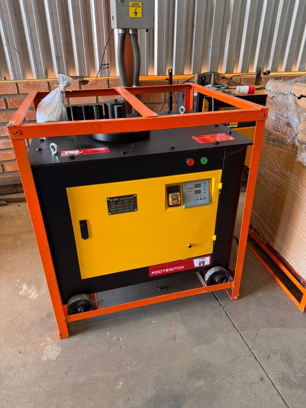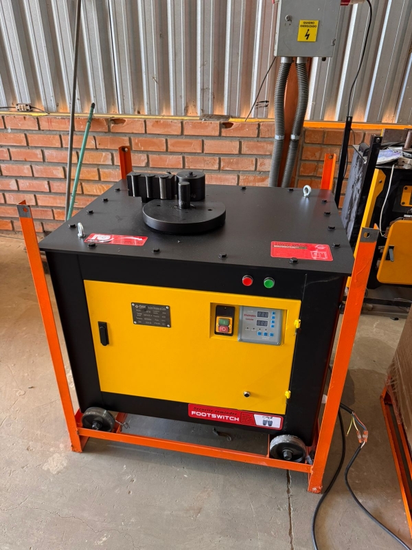Esta é uma máquina de dobrar vergalhões de aço, modelo GF36, projetada para curvar barras de reforço em diferentes formatos e ângulos. Com uma estrutura robusta em cinza escuro e detalhes em vermelho vibrante, esta máquina é ideal para trabalhos pesados em canteiros de obras. Ela apresenta um design funcional com um painel de controle bem visível e é equipada com rodízios resistentes para facilitar a movimentação. A capacidade para barras de maior diâmetro e um motor potente garantem eficiência e versatilidade.