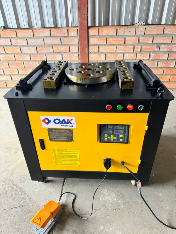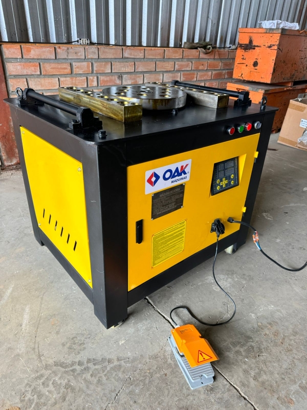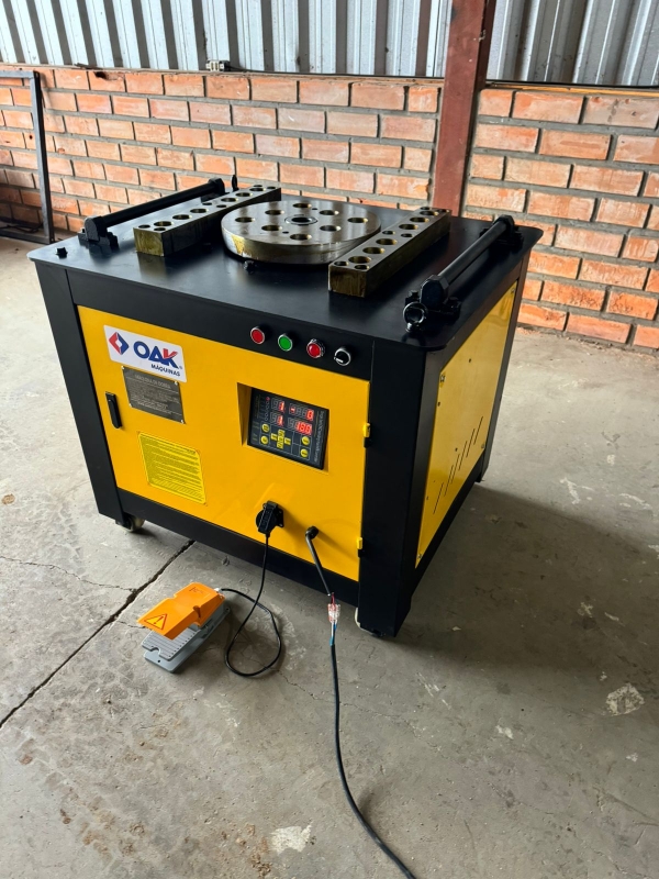 Esta é uma máquina de dobrar vergalhões de aço, modelos GW40 ou GW40N, projetada para curvar barras de reforço com eficiência e precisão. Com um design robusto em cinza e amarelo, a máquina é ideal para canteiros de obras que exigem alta performance. Possui um painel de controle de fácil acesso para ajustes operacionais e é equipada com rodízios para facilitar a movimentação. A espessura do painel de 8mm e a caixa de engrenagens (gearbox) indicam durabilidade e um mecanismo de acionamento potente.