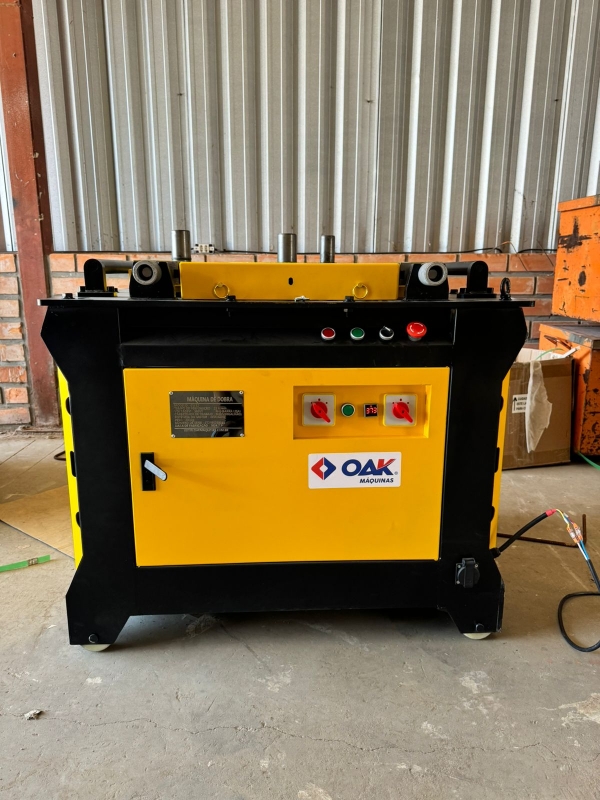 Esta é uma máquina de dobrar vergalhões de aço, modelo GW52, classificada como semiautomática, ideal para curvar barras de reforço de grandes diâmetros com alta precisão e controle. Com uma construção robusta em cinza e amarelo, a máquina é projetada para durabilidade e uso intensivo em canteiros de obras. Ela se destaca por sua operação semiautomática, que pode incluir um pedal para acionamento, oferecendo maior controle ao operador. O painel de controle intuitivo, a espessura do painel de 12mm e a potente caixa de engrenagens (gearbox) reforçam sua capacidade para trabalhos pesados.
