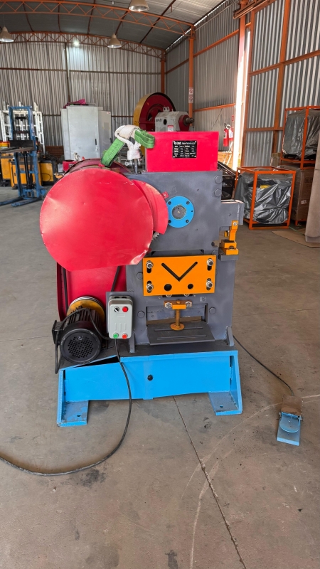 É uma máquina combinada de punção e corte de alta capacidade, projetada para trabalhos pesados em oficinas metalúrgicas, indústrias e serralherias. Com estrutura robusta e motor de 4 kW, realiza cortes de chapas, perfis, cantoneiras, barras chatas, redondas e quadradas, além de furações precisas em chapas de até 12 mm.