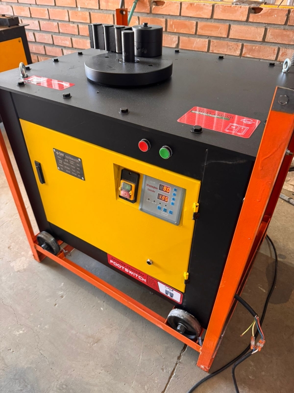 Esta é uma máquina de dobrar vergalhões de aço, modelo GF36, projetada para curvar barras de reforço em diferentes formatos e ângulos. Com uma estrutura robusta em cinza escuro e detalhes em vermelho vibrante, esta máquina é ideal para trabalhos pesados em canteiros de obras. Ela apresenta um design funcional com um painel de controle bem visível e é equipada com rodízios resistentes para facilitar a movimentação. A capacidade para barras de maior diâmetro e um motor potente garantem eficiência e versatilidade.
