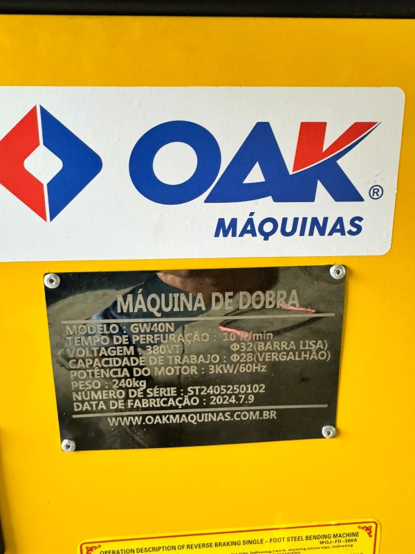 Esta é uma máquina de dobrar vergalhões de aço, modelos GW40 ou GW40N, projetada para curvar barras de reforço com eficiência e precisão. Com um design robusto em cinza e amarelo, a máquina é ideal para canteiros de obras que exigem alta performance. Possui um painel de controle de fácil acesso para ajustes operacionais e é equipada com rodízios para facilitar a movimentação. A espessura do painel de 8mm e a caixa de engrenagens (gearbox) indicam durabilidade e um mecanismo de acionamento potente.