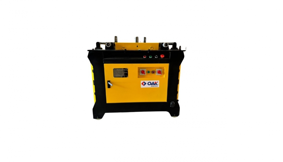 Esta é uma máquina de dobrar vergalhões de aço, modelo GW52, classificada como semiautomática, ideal para curvar barras de reforço de grandes diâmetros com alta precisão e controle. Com uma construção robusta em cinza e amarelo, a máquina é projetada para durabilidade e uso intensivo em canteiros de obras. Ela se destaca por sua operação semiautomática, que pode incluir um pedal para acionamento, oferecendo maior controle ao operador. O painel de controle intuitivo, a espessura do painel de 12mm e a potente caixa de engrenagens (gearbox) reforçam sua capacidade para trabalhos pesados.
