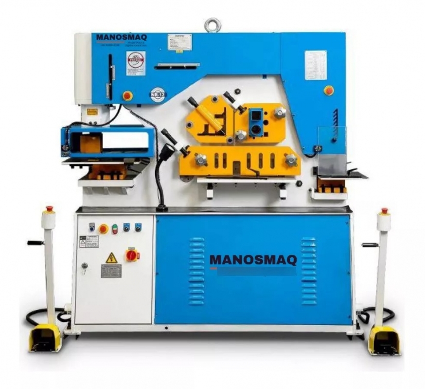 Esses equipamentos são destinados ao processamento de chapas, barras e perfis de metal, oferecendo funcionalidade multifuncional. Possuem uma capacidade de 90 toneladas, capacidade máxima de corte variando entre 15 a 20 mm, e comprimentos máximos de corte de 400 mm e 480 mm, respectivamente.